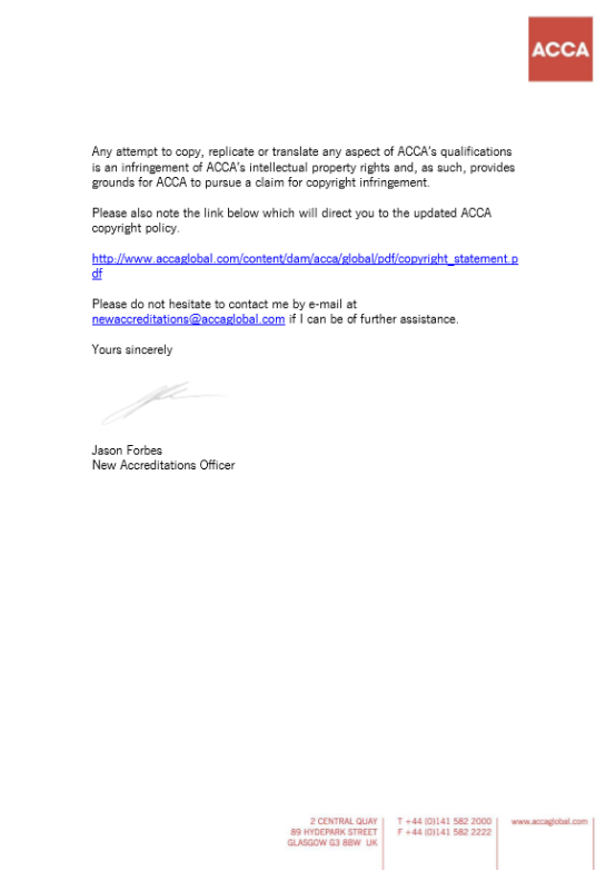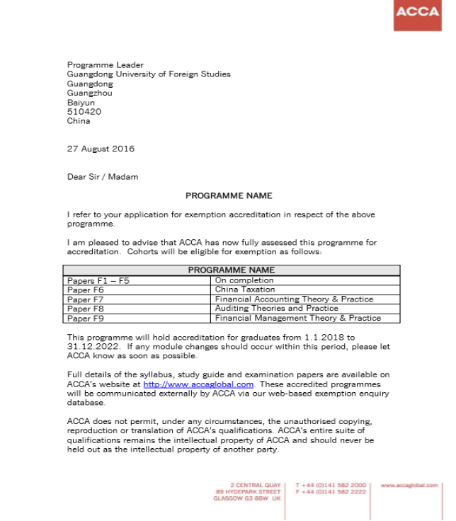 近日,伟德bv国际体育,BETVICTOR官网MPAcc项目ACCA免考科目的申请工作,经过MPAcc教育中心积极与ACCA全球教育中心的沟通,认真地提供免考科目认证所需要的各项资料,并经多次资料整理、审核,最终ACCA全球教育中心给予广外MPAcc项目的学生F1-F9全免考的资格,5年内有效。ACCA免考科目审核通过将为广外伟德bv国际体育MPAcc学生提供更好的、更快捷的平台,他们参加ACCA资格考试时将只需要进行P阶段的4门课程的考试,大大减少了考试压力,同时在专业选修课方面嵌入了ACCA P阶段的课程,全面帮助他们顺利通过考试。
