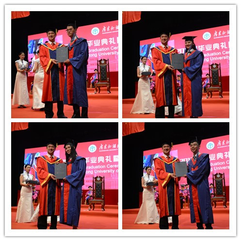 毕业生宣誓结束,校党委书记、校长隋广军教授为毕业生们一一颁发学位证书并拨穗合影留念。