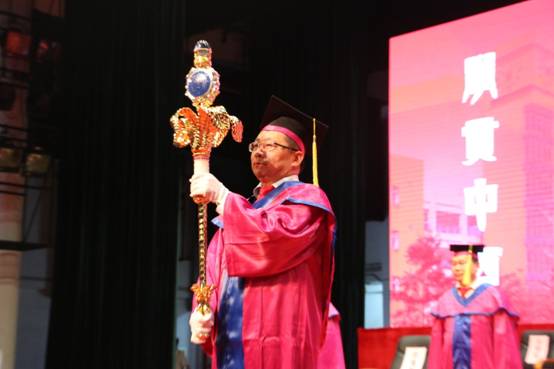 中午15:00整,院长刘中华教授执伟德bv国际体育权杖,与14位主礼教授入场。庄严肃穆的国歌声响彻会场。