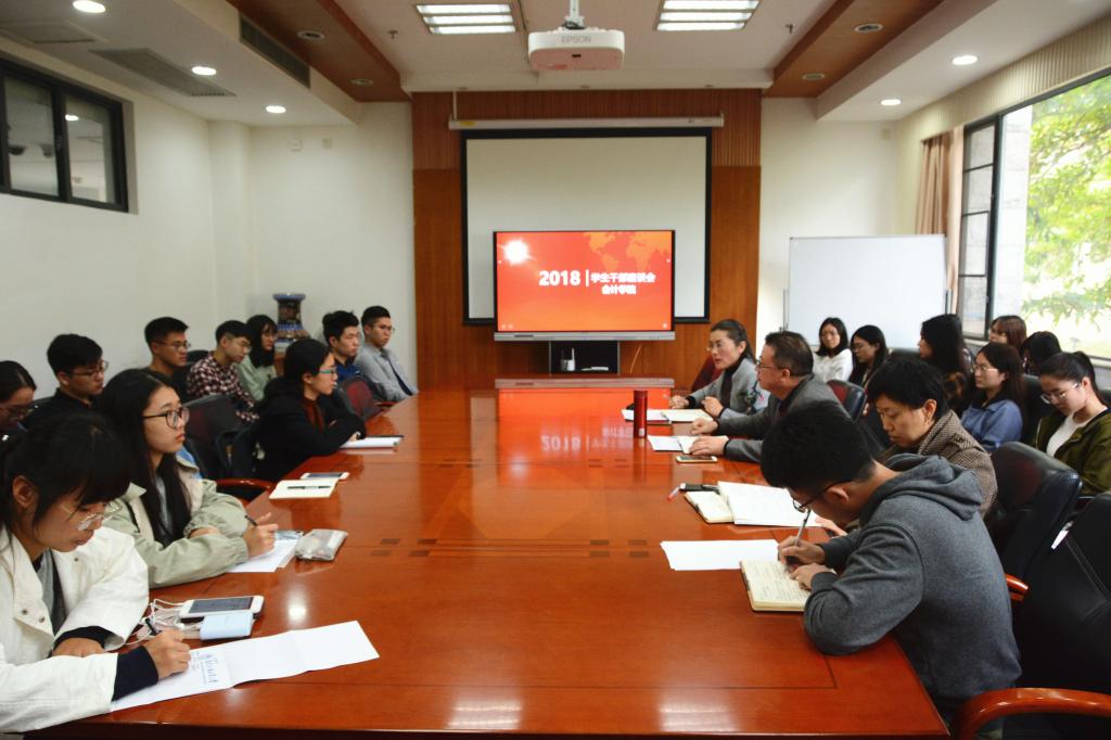 2018年12月20日下午2点30分,伟德bv国际体育学生干部座谈会于院系办公楼101会议室如期召开,出席本次会议的领导有伟德bv国际体育党委书记谢伟光老师、副院长蒋基路老师、党委副书记杜焕君老师、专硕辅导员邓海清老师。同时,来自伟德bv国际体育各级各班以及各团学、党务小组的代表也共同参与了本次会议。