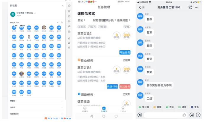 《财务管理学》课程组负责人龙文滨教授与任课教师庄明明、教学助理江烁楠、柯依辰对现有热门在线教学平台,如雨课堂、腾讯会议、QQ会议、钉钉课堂等,进行逐一测试,记录在线教学过程中是否卡顿、能否互动、在线测试、签到考勤等事项,并结合本门课程的授课特点进行了筛选,最终选定使用钉钉课堂进行在线教学,并使用启课程平台进行签到、预习和课堂互动。