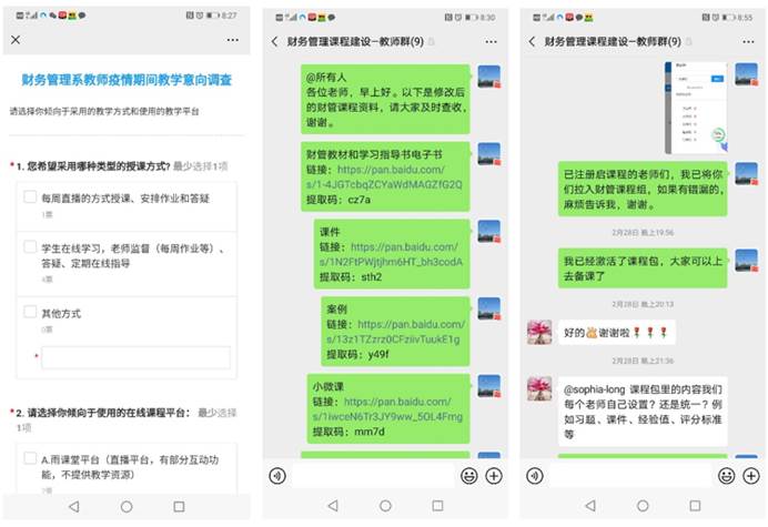 组建财务管理课程建设——教师微课群,讨论在线教学安排,并对教师在疫情期间的教学意向进行问卷调查,了解课程组教师的在线教学需求。