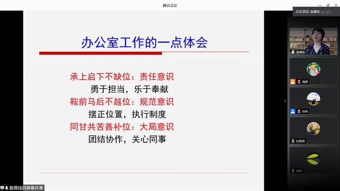 袁薇佳围绕公文要素、学院常用公文文种写作、讲话稿写作等内容,通过生动鲜活的写作案例分析以及公文处理工作方面的一些应用技巧与参会人员进行了分享,强调办公室工作要做到“承上启下不缺位,增强责任意识;鞍前马后不越位,增强规范意识;同甘共苦善补位,增强大局意识。”