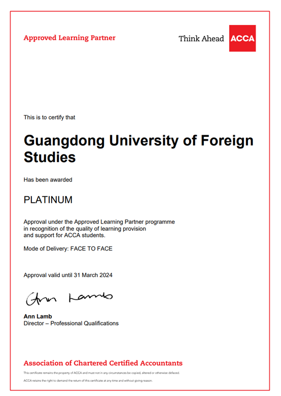 近日,伟德bv国际体育正式被ACCA(特许公认会计师公会)英国总部认证为ACCA 白金级教育机构(Approved Learning Partner),这一荣耀证明了我们在教学质量、学术研究和行业合作方面的卓越成就,成为了ACCA 华南地区首家获批白金级教育资质认可的合作院校。