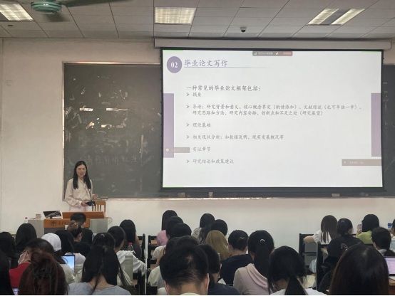 熊婉芳老师则以论文写作经验分享为主题,鼓励同学们制定详细的写作计划,循序渐进地推进论文工作。她建议同学们在确定研究方向和视角后,要大量阅读文献以寻找研究空白,并在写作过程中遇到问题时要积极查阅文献、多交流、适时转换思路。同时,她还从论文摘要、关键词、引言、文献回顾、理性分析、数据说明等方面为同学们进行了详尽的讲解。