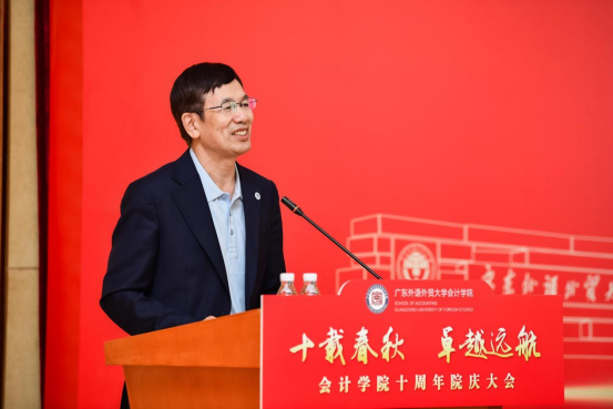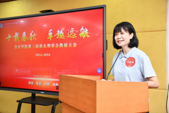 毕马威华振会计师事务所(特殊普通合伙)广州分所党委书记,分所负责人,1997级校友王洁女士作为校友代表发言,她回顾了在广外求学的美好时光,感谢学院的悉心培养和老师们谆谆教诲,也赞叹学院日新月异的发展和变化。她表示,作为会院校友,她将接续奋进,开拓创新,持续关注学院事业发展,为母院、母校的建设贡献力量。