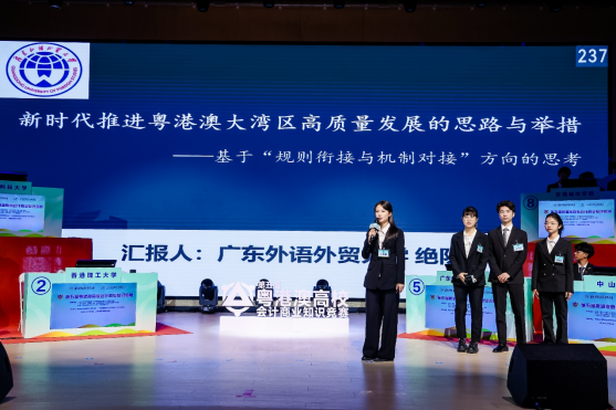 本次大赛聚焦粤港澳大湾区的发展与会计知识的实际应用,以“如何全面提升粤港澳大湾区的竞争力与影响力”为主题,采用展示和答题相结合的形式。在展示环节,参赛队伍需依据指定方向为大湾区的发展建言献策,识别湾区面临的具体问题,并提出切实可行的解决方案;在答题环节,参赛队伍则要凭借自身的会计专业知识和商业新闻积累,与其他队伍展开知识比拼。无论是展示还是答题,选手都需具备扎实的专业基础、冷静自信的心态,并展现出强大的团队协作、灵活应变和风险决策能力,全面考验了他们的综合素质。