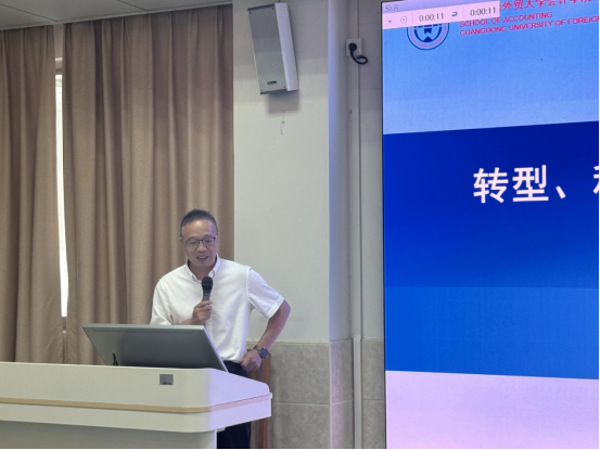 会议第一部分,院长余鹏翼围绕“转型、科研、团队、平台”四大核心方向,系统总结本学期工作进展并提出下一步部署。一是学科转型:深化“宽口径、厚基础、重交叉”培养模式。余鹏翼指出,学院以“学科交叉+实践创新+跨界融合”为路径,推动传统学科与新兴领域深度融合,强化学生跨学科能力培养,着力构建适应新时代需求的“宽口径、厚基础”人才培养体系,为学科长远发展注入新动能;二是推进“有组织的科研”:针对科研组织模式优化,余鹏翼强调,有组织科研需瞄准国际学术前沿与学院学科建设需求,推动科研方向向“学校、学院需要我干什么我就干什么”转变;三是强化团队建设:重点布局三大特色方向。为凝聚科研合力,学院着力打造“智能会计”“跨国并购”“环境审计”三大科研团队。他表示,未来将通过资源整合、协同攻关,推动各团队在关键领域取得突破性成果,形成学院科研新优势;四是夯实平台支撑:擦亮“广东省人文社科重点实验室”品牌。广东省人文社科重点实验室建设作为学院科研创新的核心载体,下一步将进一步强化平台的辐射带动作用,为学科建设与科研突破提供坚实支撑。