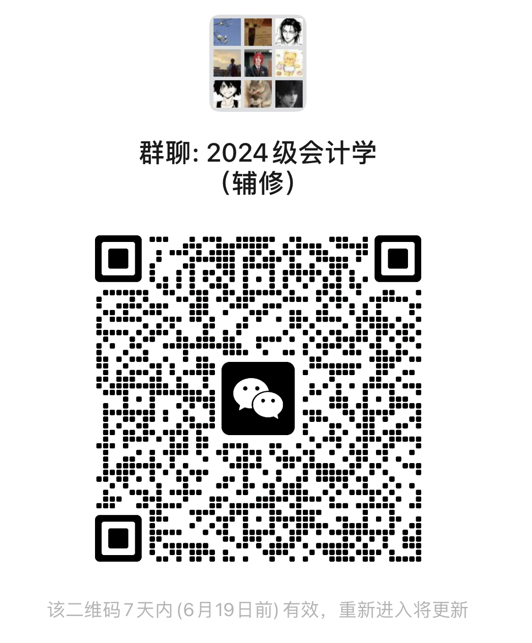 2024年辅修专业学生(主修为2023级)的课程将于9月3日开始上课。请拟录取同学扫描以下二维码加入2024级会计学(辅修)群(昵称请改为“南或北+真实姓名”),后续事宜将通过微信群通知。