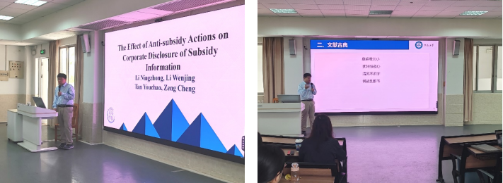 在交流与讨论环节,参会老师就选题来源、衡量指标、经济后果等,与谭教授进行了现场交流互动,谭教授就老师们的提问进行了详细的解答。最后,龙文滨教授对谭教授的分享进行了总结并致以诚挚的感谢,希望同学们能够从谭教授的讲座中得到启发。