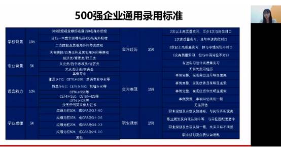 首先,Michelle老师向同学们从学校背景、专业背景、语言能力和学业成绩四个方面介绍了500强企业用人标准。讲述了企业更倾向的海归类型,展示了企业最新的用人标准。在这个过程中,主讲老师还结合同学们的未来规划,向同学们进一步分析了留学经历对职业发展的优势。让同学们更好地了解留学对于自身发展的意义。