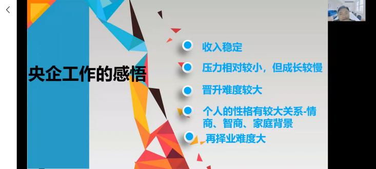 最后,Stephen老师也分享了自己在央企实习的切身感受以及看到的工作环境,言谈举止,穿衣打扮和思维方式。介绍了在央企工作有收入稳定、压力相对较小,但成长较慢、晋升难度较大以及再择业难度大等特点。同时,Stephen老师还从实习经历,工作氛围,人际关系等方面介绍了投行与审计财务人员的能力要求并进行了投行案例的分享。