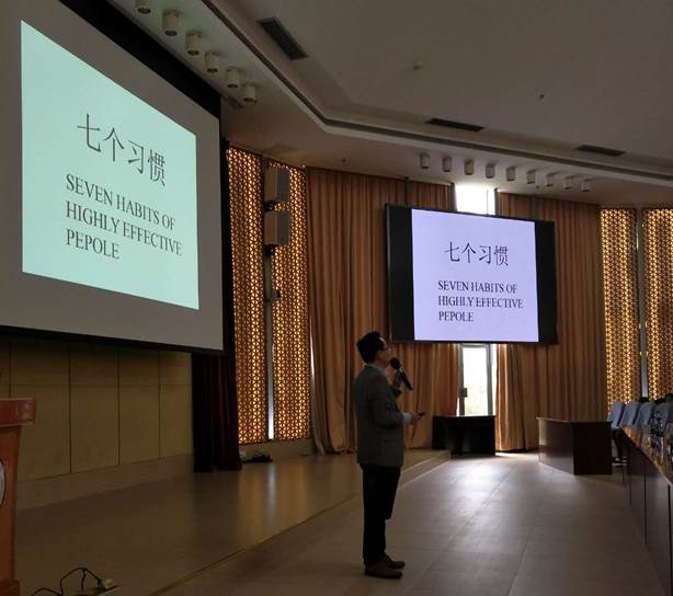 吴珑作了题为《高效能人士的七个习惯》的生动演讲,他首先让大家思考并写下自己的好习惯、不好的习惯,最想达成的目标、最想改进的人际关系,激发了同学们的参与热情。然后逐条解释了“积极主动;以终为始;重要的事情先安排;从双赢出发;先理解别人,再被理解;协同合作,综合统效;时时磨锯,不断更新”的7个习惯,他希望同学们能学以致用,从知识、技能、目标三个方面改进自己。