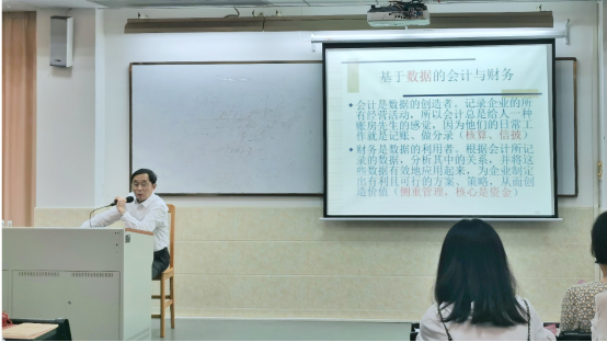 接着,柯老师从自身多年的财务管理岗位管理经验和人生阅历出发,着重介绍了当代社会财会负责人所具备的基本素质,包括品德高尚、知识渊博、经验丰富和能力完备,同时为同学们未来的事业发展指明了前进的道路。