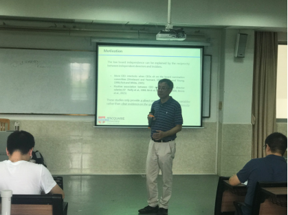 2019年5月15日下午,澳大利亚麦考瑞大学经济与商业学院田钢教授应邀做客伟德bv国际体育“财会大讲堂”第四十八讲,在我校大学城校区D312教室为伟德bv国际体育师生作了主题为“礼尚往来:任命非通过考核的独立董事”的学术报告。本次讲座由伟德bv国际体育主办,伟德bv国际体育副院长蒋基路副教授主持,伟德bv国际体育教师及研究生参加了本次学术报告及交流活动。