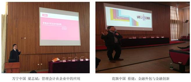 在随后的主题发言中,万宁中国高级财务经理梁志斌先生从“产品、服务成本核算及定价”、“预算与战略、决策管理”、“投资和筹资管理”、“绩效管理”四个方面为同学们介绍管理会计在企业中的作用,并与财务会计的工作内容进行了多维度的对比。花旗金融副财务总监蔡健先生围绕金融外包和金融创新两方面展开介绍,描述了银行业务的前台、中台和后台分工,阐释了银行服务外包行业发展的关键因素,展望了未来银行在电子化、自助化、网络化、移动化的特征,以及“四化”所需要的关键金融科技,最后提出,无论同学们将来从事任何职业,都需要informative(信息处理), integrity(诚实守信), creative(创新进取), self-planning(自我规划)这四项至关重要的软技能。