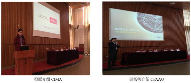 在蒋基路副院长简短的欢迎辞后,讲坛正式开始。皇家特许管理会计师公会(CIMA)梁雁先生给同学们介绍了什么是CIMA及CIMA的职业资格框架;澳洲会计师公会(CPAAU)邵杨帆先生为同学们介绍了CPAAU的发展、办事处、及考试科目和考试特点等情况,特别提到伟德bv国际体育审计专业和会计专业已经分别于2012年和2013年取得了CPAAU的专业教学认证。