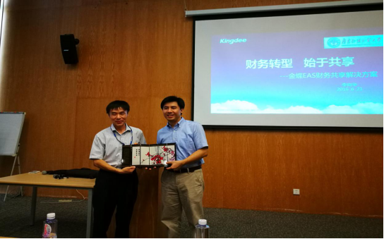 在听取金蝶展厅工作人员详细介绍了公司发展历程、公司发展规模、公司主要产品、公司文化建设以及公司的未来发展规划后,调研活动移步至金蝶公司会议室进行更近距离的分享交流会,会议由金蝶傅仕伟总监主持。会议伊始,汤院长发表了讲话,讲话中,汤院长表达了对金蝶公司热情招待的诚挚感谢,并希望学员能够在这次交流会中有所收获。同时,汤院长表示希望能够进一步加强与金蝶公司的合作交流,进一步开展校企合作事项并向金蝶公司赠送了大学纪念品。