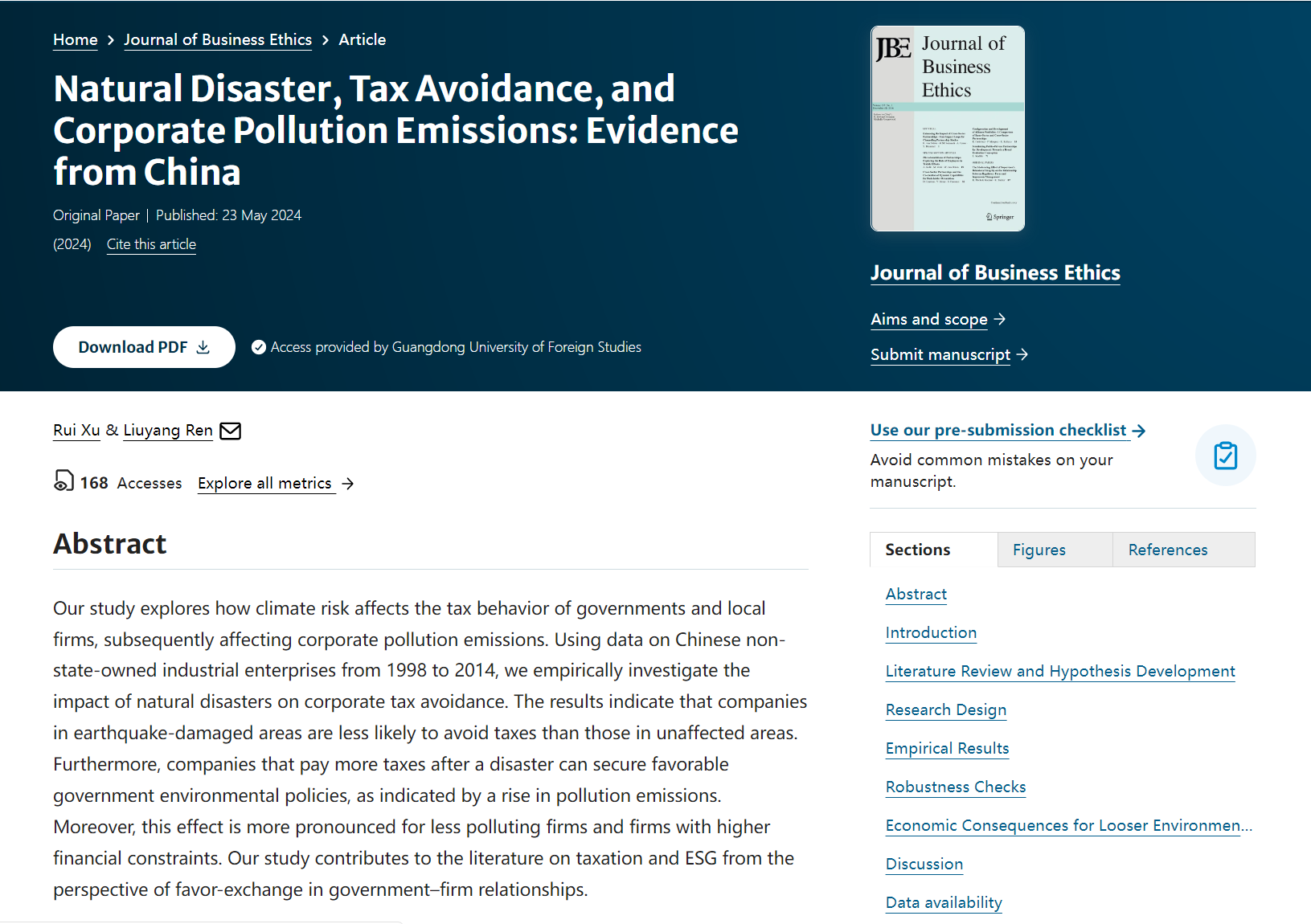 近日,伟德bv国际体育审计系讲师许锐和会计系讲师任柳杨合作完成的论文《Natural Disaster, Tax Avoidance, and Corporate Pollution Emissions: Evidence from China》在线发表于国际A类期刊Journal of Business Ethics。许锐为第一作者,任柳杨为第二及通讯作者,伟德bv国际体育为唯一单位。