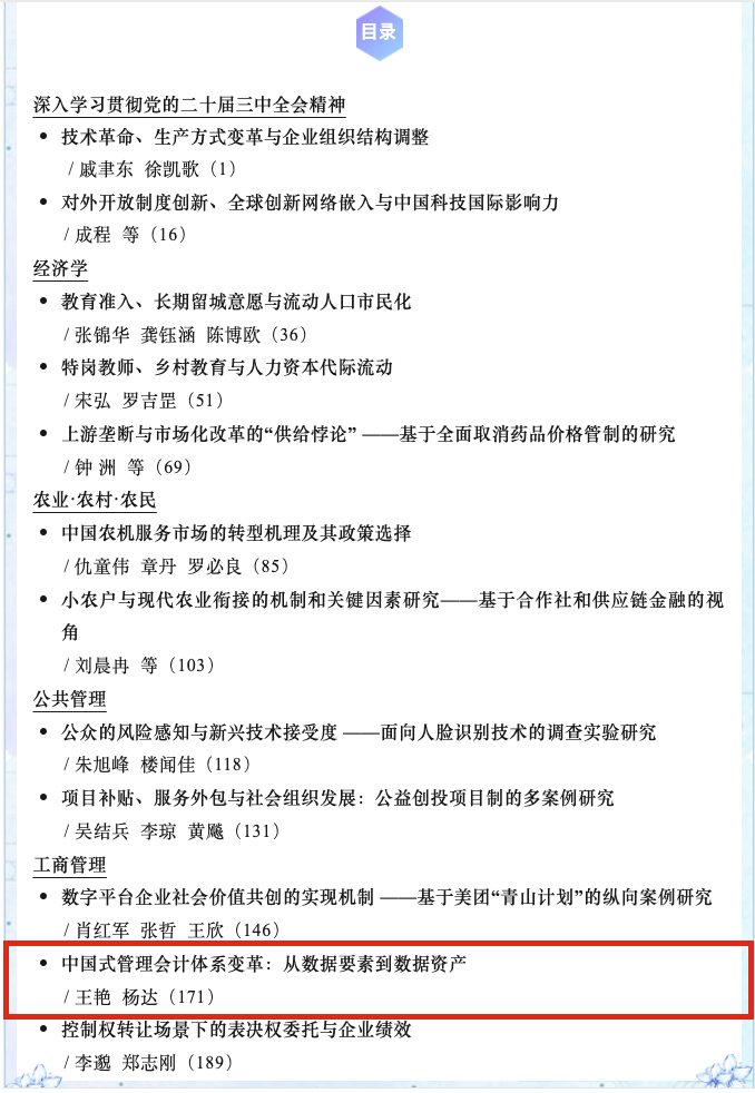 近日,我院王艳教授及其合作者的研究成果“中国式管理会计体系变革:从数据要素到数据资产”在顶级学术期刊《管理世界》2024年第10期正式刊出。
