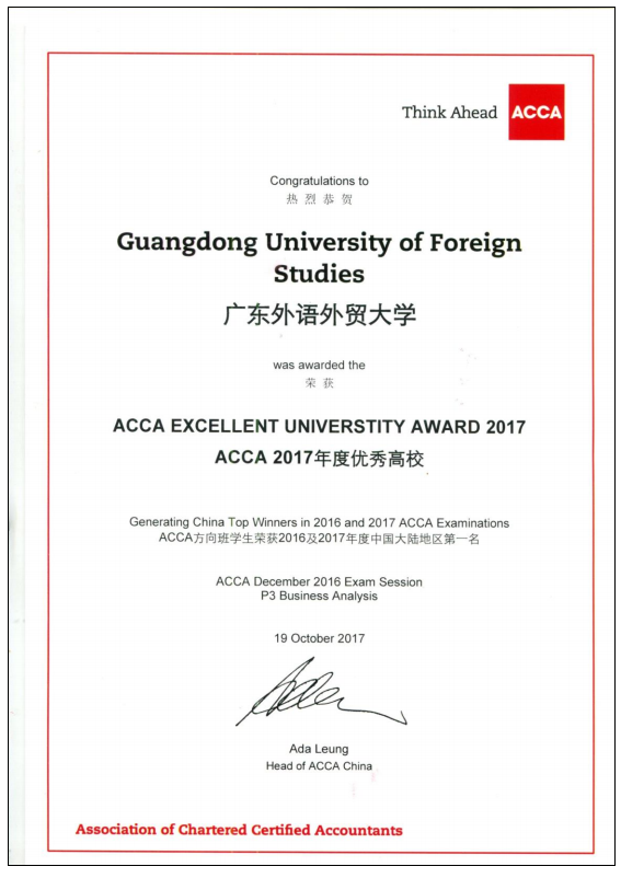 2019年与高顿教育集团达成战略合作协议,共建ACCA项目中心。各届创新班同学在全球统考通过率、考试成绩、竞赛获奖、读研升学以及就业层次等方面,在全国开设ACCA成建制本科班项目的近200家高校中名列前茅。广外ACCA项目2017年度荣获优秀高校奖、2018年度荣获华南区合作高校卓越成就奖、2021年度荣获优秀高校奖等。2020年获得ACCA全球的黄金级教育资质认证,2023年获得白金级教育资质认证,是华南地区首家获得最高级别认证的高校。
