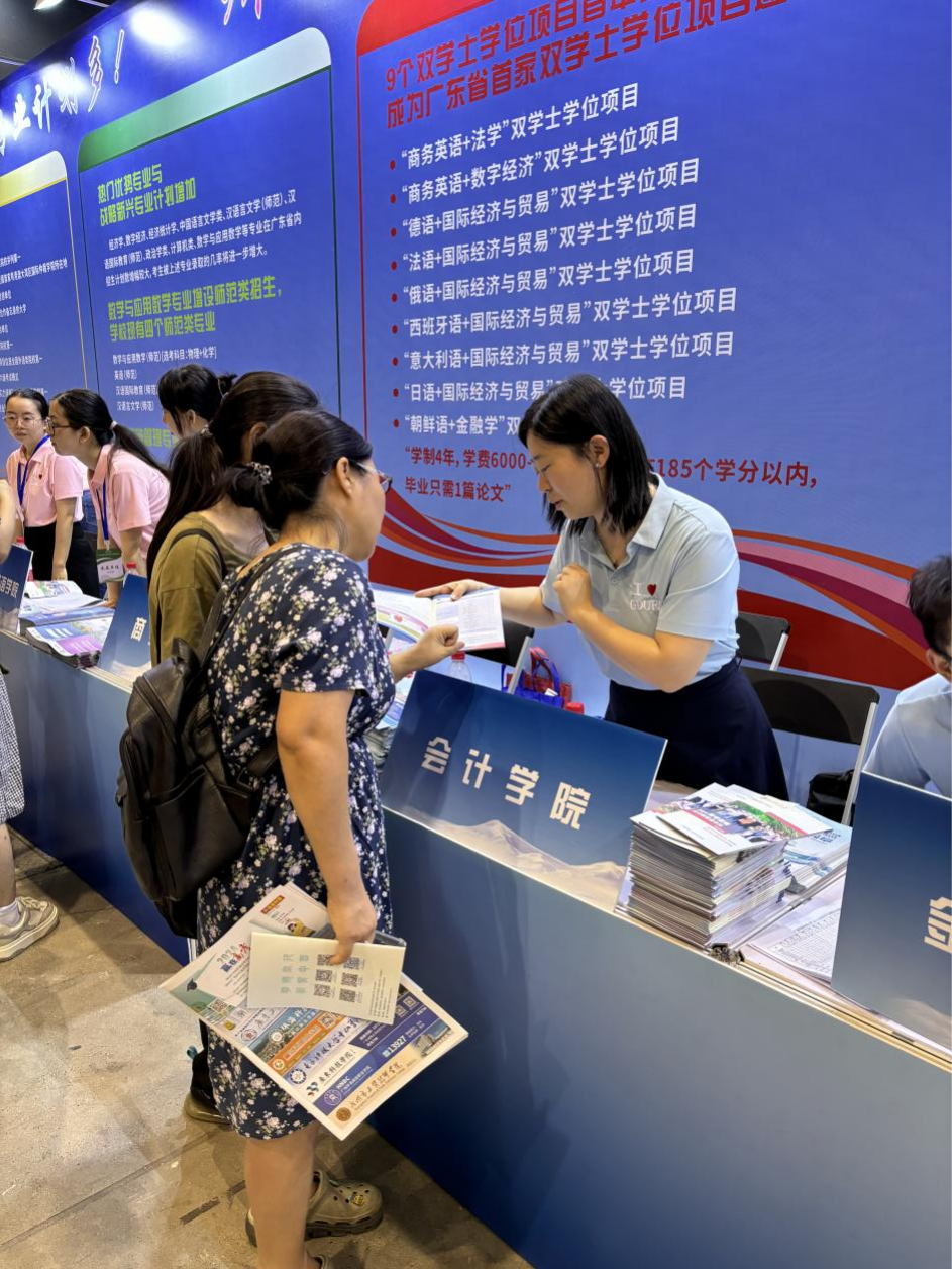 6月27日全天,学院国际组织创新班项目主任孙黎老师、审计系刘儒昞副教授前往琶洲展馆中心开展招生宣传活动。两位老师热情且耐心地为参会者介绍广外招生亮点与最新政策,解答考生和家长特别关注的双学士学位项目。咨询人员络绎不绝,活动现场非常热烈。