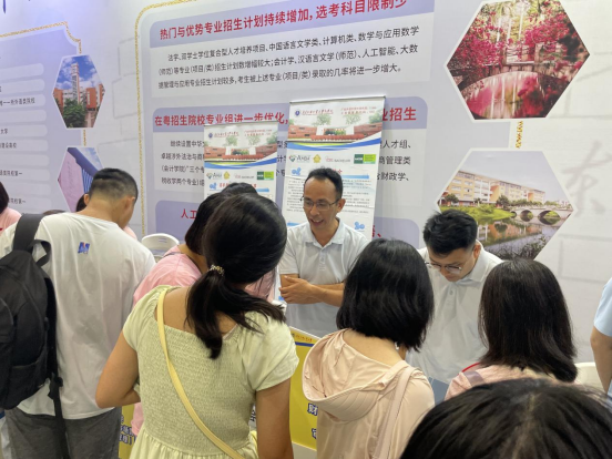 次日,财管系教师王建业、会计系教师王得力转战2025年琶洲展馆高招会,面向全市考生及家长开展宣传。团队通过发放宣传册、展示办学成果、一对一答疑等方式,全方位介绍广外“专业+外语”复合型人才培养模式及毕业生就业升学优势。现场互动频繁,千余份招生资料短时间内一扫而空,现场气氛热烈,众多考生表达报考意向。