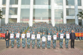 黎书记代表学院对所有承训教官和新生同学们表达了亲切的问候,并对新生们的精神面貌和训练成果给予了高度评价,黎书记说到,流血流汗不流泪,掉皮掉肉不掉队,希望大家能够把吃苦耐劳、遵守纪律、敢于奋斗的作风运用在生活和学习上。随后,由黎冬书记和李海琳副书记为教官代表及新生代表亲自发放慰问品,并做合影留念。