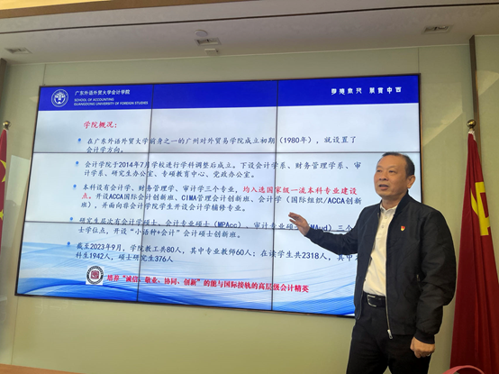 王韶华介绍了华兴会计师事务所广东分所的基本情况,包括华兴的创办及发展历程、主营业务、职业操守要求等。同时,他也表示,广外是华兴往年招聘的重要来源,表达了对优秀人才的渴求。冯琨琮详细介绍了华兴的党团组织建设的情况,通过“双融合”“双促”机制,将职业道德教育、诚信教育和使命教育融入特色主题党日活动。