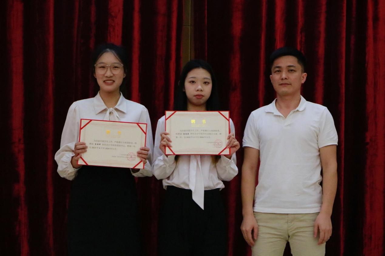 颁发聘书环节,由刘志鹏老师、李烨晖师姐、谢钰婷师姐分别为第五届第二任团委、第八届学生会学生干部颁发聘书。