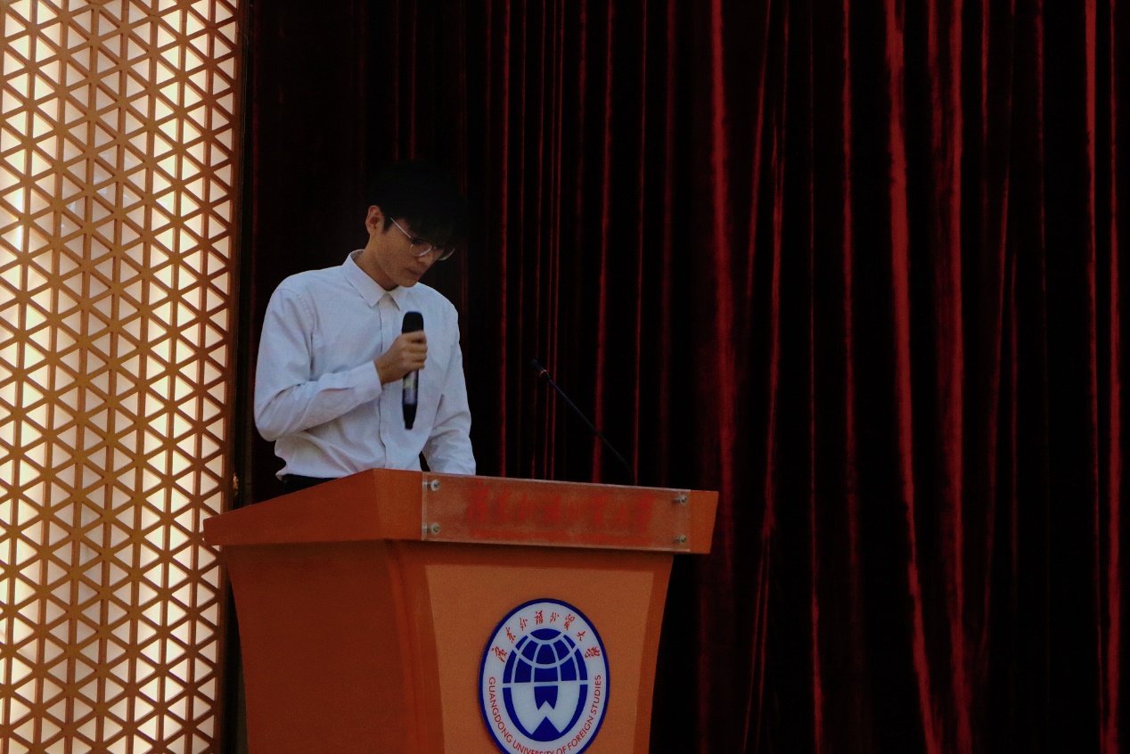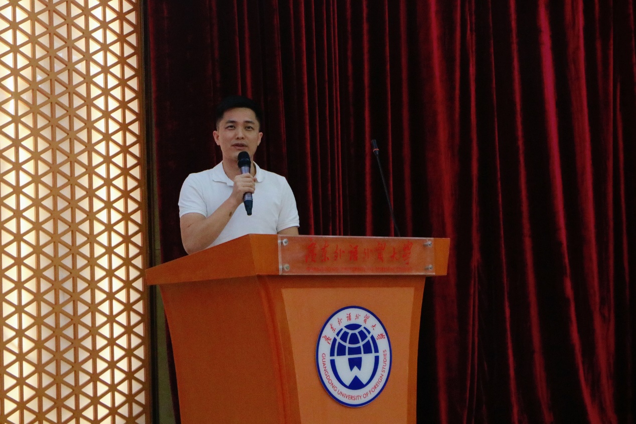 刘志鹏老师上台发言。刘志鹏以歌曲《我们会院团学人》为引,详细讲述了团学概况、图标与精神、手势与文化和要求与展望。最后,刘老师再次强调团学的愿景——做值得学生依靠和喜爱的品牌。