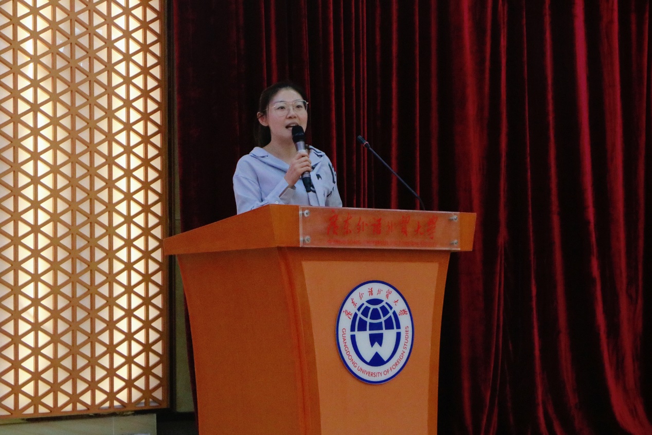 李新璐老师上台发言。李新璐通过几位优秀师兄师姐的事例介绍,强调学生干部应具备榜样力量,同时提出学生干部应建立正确的人生观和价值观、不断学习和提高专业能力、提高沟通和交流能力以及培养团队合作精神。