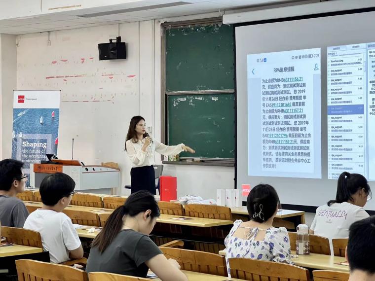 随后,ACCA会员、中国南方航空公司陈彦君分享了她自身的职业发展轨迹,强调了ACCA考试和工作的重要性。陈彦君以中国南方航空为例,详细解析了财务共享中心的实务操作和挑战,强调了财务人员需要具备的发散思维和数字化、智能化、标准化的能力。陈彦君也强调了财务共享不仅仅是数字化和智能化的过程,更是一场大打共享的战役——通过打破数据孤岛,实现信息的全面共享,提升企业的整体运营效率。在如何成为有为青年的主题讨论中,陈彦君提出了健康体魄的重要性,鼓励同学们有计划地进行体育锻炼。同时,她也强调了持续学习、多阅读经典的重要性,要用长远的眼光去规划事业的发展。此外,还提倡同学们发展一个兴趣爱好,敢于接受挑战,见贤思齐。