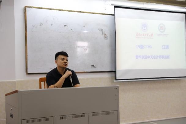 接着上台分享的嘉宾是19级CIMA班的江通师兄,同样就职于普华永道会计师事务所。江师兄从入职准备工作、人际关系处理、专业知识储备三方面进行了详细的分享,分析了事务所相较于企业不同的发展路径。