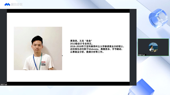 最后,伟德bv国际体育2013级会计学校友姜添尧分享了自己在校学习经历及职场经历。他从自己的大学生活讲起,从大一大二的开拓认知阶段到大三的加强自我认知阶段,鼓励大家可以通过MBTI等职业性格测试等方法来更好地认识自己,并提前做好未来的职业规划。姜添尧还分享了毕业至今三份工作所带来的收获、转换节点及自身发展契机,为同学们带来新的职业思考。他对同学们提出建议,“职场竞争力=核心竞争力+附加竞争力”,鼓励同学们无论是考研、考公、找工作都不能停止思考和学习。