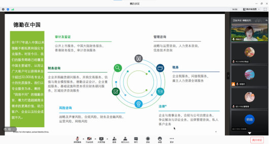 公维兰从“智能工作流自动化”、“审计分析和数据可视化”以及“人工智能”几个方面分享了德勤会计师事务所的Reimagine Audit创新理念以及从组织层面确保数字化转型的战略方向,展示了目前德勤所使用的几种智能创新应用工具平台,介绍了现有的审计创新工具——智能财报生成系统,就其具体工作流程让我们切实的感受到了科学技术发展对审计行业的影响。还分享了500强企业的审计案例,使得学院师生更好地理解何为管理“人”,管理“事”,管理“时间”,让同学们更深入了解了专业实操过程中将会面对的种种情况以及解决方案。管理“人”是指以小组为单位进行学习和工作,其中team leader需要善于协调各个组员之间的关系;管理“事”就是对于每个小组成员的相关工作都要具体跟进;管理“时间”指合理规划、协调时间,实现高效率学习和工作。公维兰还向同学们分享了一些面试技巧,让同学们在面试中更好地展示自己的创意和能力。