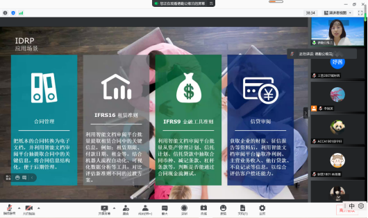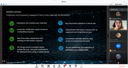 Stacy介绍了德勤会计师事务所所用的OMNIA、IDRP、Deloitte Connect、Reveal等等工具:OMNIA便于记录和审计,利于审计程序之间的交互沟通,保证高质量审计;IDRP对不同类型文档进行分析比较,抓取字段;通过Deloitte Connect实时在线与客户保持沟通;通过Reveal进行数据分析。这些工具的介绍开阔了参会师生的眼界。Stacy还介绍了未来审计创新转型方向——将人工智能与人才网络相结合,实现科创一体化,加速企业创新转化落地,与政府、企业打造合作共赢的局面。