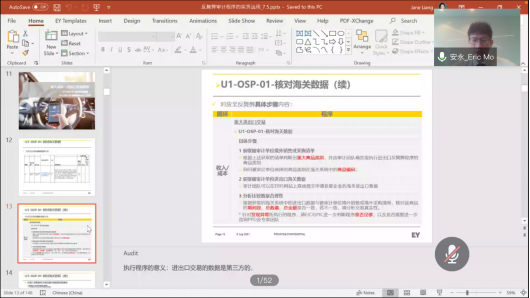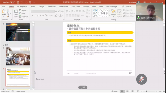 梁芳经理介绍了数字化审计的定义,让同学对数字化审计有初步了解。列举出数字化审计的工具,指出它们在数据的采集、转换、清理、验证,与在查询分析、多维分析、数据挖掘等方面的作用。通过案例介绍,她分析了实务中典型的数据问题,指出安永在数字化审计中强调数据驱动或优先原则,获取审计对象数据范围不仅包括本企业的经营数据,还有更多维度的管理、业务、生产等方面数据的记录、分析和融入,构成对企业全方位的数据画像,同时要与客户进行更加深入的沟通,提供更有价值的服务。