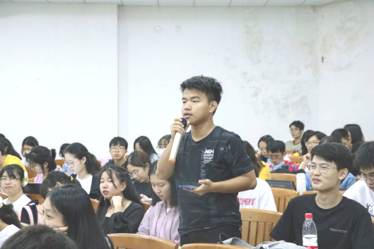 在观众提问环节,同学们踊跃举手发言,展示班集体的班委耐心细致地回答问题,积极为新生班委解答了同学们关于提高活动参与积极性、奖励制度、活动参与率、提高班级成绩、增强班级凝聚力等方面的疑惑。