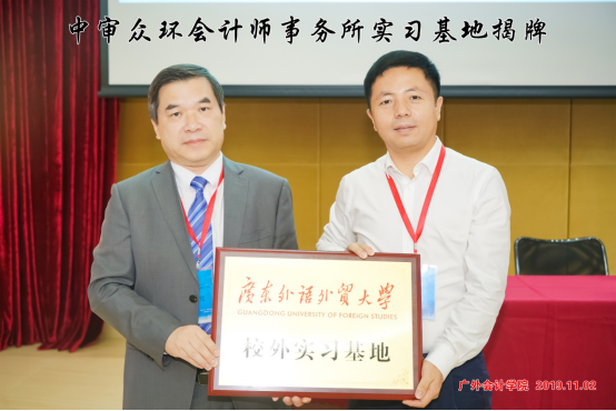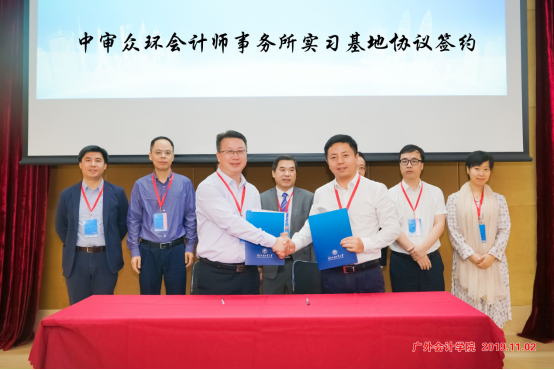 谢伟光书记与韩振平所长分别代表伟德bv国际体育与中审众环会计师事务所广东分所签订实习基地协议,并由焦方太副校长与韩振平所长共同揭牌中审众环会计师事务所实习基地。