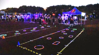 操场沿途,还设有闯关小游戏关卡。游戏关卡一共有三个,分设在操场的不同地点。有考验记忆力和动手能力的图形传递,也有需要协调能力的跳格子,还有考验团队默契的向后丢小球。无需只言片语,一路默契到底,这次荧光夜跑让假草场上充满了欢声与笑语,快乐与感动,温暖与激情。