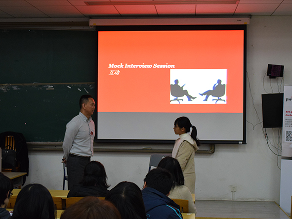 紧接着,颜志伟根据全球CEO调查得出的结论,提出当下公司需要新一代有创新精神的人,并鼓励同学们努力提升自己。为了更好地帮助同学们认识如何进行职业规划,颜志伟设计了两个互动环节帮助同学们提升面试能力和简历水准。第一个环节是模拟面试,他邀请两位同学上台并对她们分别提出了三个面试问题,从她们的回答中提炼了一些面试技巧传授给在场同学们。颜志伟强调了做好面试功课以及个人价值与公司价值互相匹配的重要性。