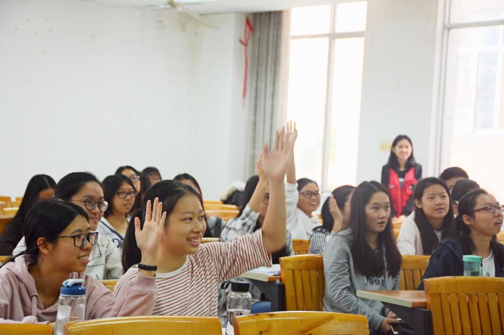 本次分享会由三位师兄师姐分别上台介绍经验、现场答疑解惑与有奖问答,以及观看老师们对专业的看法的采访视频三个部分组成。首先是刘庆克师兄上台讲话,他把大一新生在大学的各种需求作为出发点,从学习、社团、比赛、将来工作等方面的需求详细讲解,将自己的经历和看法毫无保留地分享给同学们。对于选专业这一历史难题,他给我们介绍了专业分流的具体操作程序,在他看来,会计、审计、财管这三个专业基本无差别,“学什么不重要,主要看自己的兴趣”,希望同学们遵循自己内心的想法,找准自己的方向。他还强调同学们不应把进入四大作为自己的终极目标,我们不应给自己的人生设限,青春就应该勇于挑战,用于拼搏。
