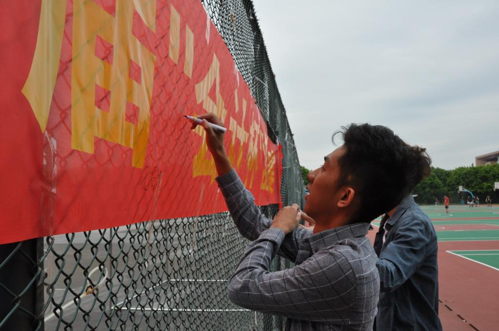 在队长们发言结束之后,各篮球队队长作为代表在贴有“横幅上签字,接着全体队员与全体人员一齐列队在横幅前合影留念。