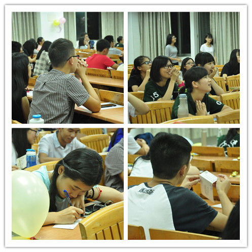 在开场白之后,芷瑶师姐、文彬师兄先后上台分享经验,而后是以击鼓传花的形式请观众上台讲讲自己的大学生活体验。接着,在冠明师兄上台与大家分享之后,活动进入了第三个环节,即观众问题收集。在此间隙,勤俭部的同学还为我们送上了充满温情的班导小视频。