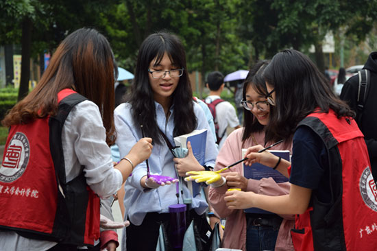 每天准时响起的广播、不时偶遇的懒洋洋的小猫、傍晚放学时恰到好处的晚风、和同学好友在广外经历的一切……在贴满各班级合照的KT版上,同学们用各色染料留下掌印,留下对母校难以磨灭的记忆。