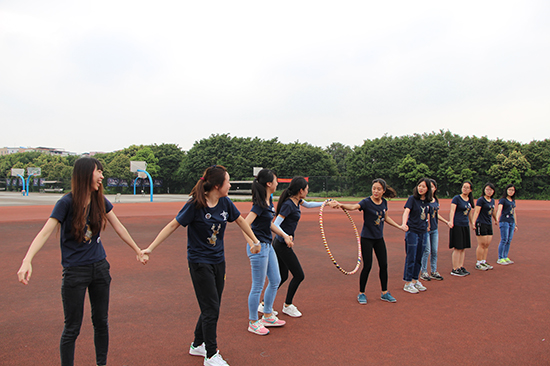 草场的另一端,一列人一手搭在前面的人肩上,一手拉着他的脚,一齐单脚跳向前进,全队大声而整齐地喊着“一二、一二。”“链接加速”更加考验团队合作能力,只要有一个人出现问题,不仅整个队伍会停下来,队伍的比赛时间也会被拖长。