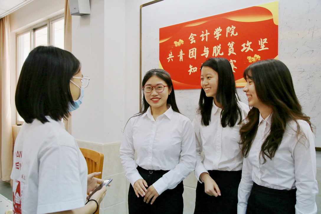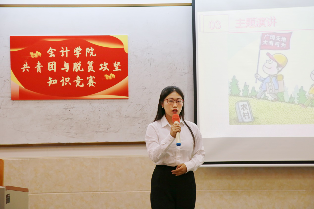 紧接着进行知识抢答环节,该环节以共青团与脱贫攻坚知识设置题目,选手们在抢答过程中反应敏捷、思维活跃、正确率高、表现出色,体现出会院学子良好的政治素养和青年担当。