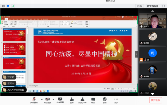 6月28日晚7点,伟德bv国际体育党委书记谢伟光在线上为伟德bv国际体育120余名同学作了主题为“同心抗疫,尽显中国精神”的思政宣讲会。