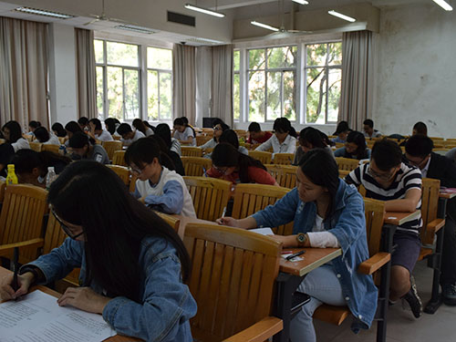 开考前十分钟,学员们在教室外依次签到,之后进入教室按规定就座,从容不迫地准备考试。紧接着,监考人员提醒同学们准备好纸笔并宣读了考场规则和纪律。两点整考试正式开始,监考人员当众拆封试卷并迅速分发给每位学员。学员们在拿到试卷后大致浏览了一遍卷子,从整体上把握试题方向。完成阅卷之后,学员们从容起笔,全神贯注地答题,教室里一时尽是纸笔沙沙声。
